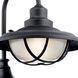 This outdoor post lantern from the lodge-inspired Harvest Ridge(TM) is reminiscent of a barn light. Its caged bottom encases Clear Ribbed glass with an inside etch, which diffuses light for optimal visibility.